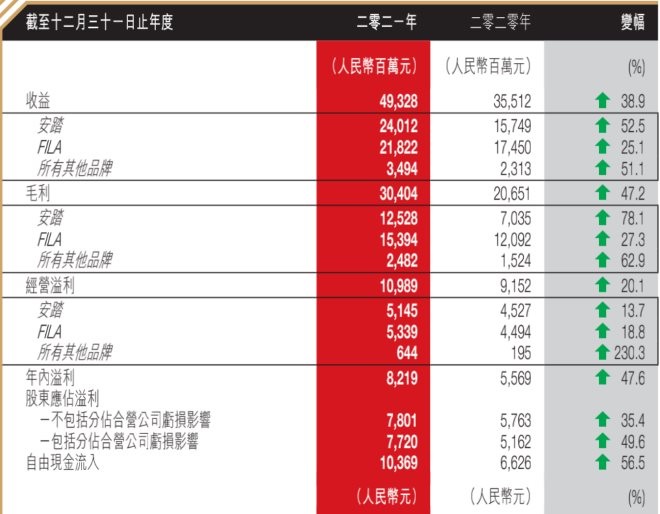不止安踏,本土鞋服巨頭在2021年的業(yè)績(jī)都相當(dāng)亮眼: