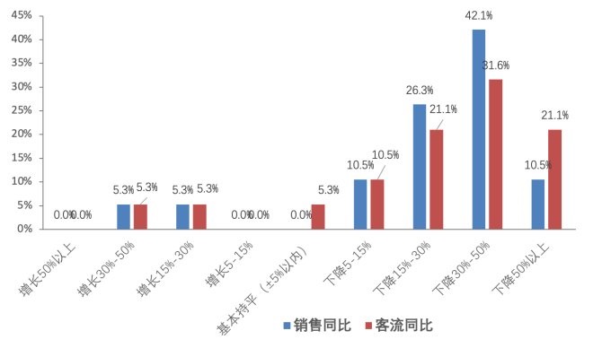調研顯示,2022年以來,超過九成(95%)的品牌企業(yè)整體銷售同比去年同期有所下降;超過七成(73.7%)的品牌企業(yè)表示其銷售和客流的下降幅度均超過15%。線上銷售方面,與去年同期基本持平(0.21%);目前,品牌企業(yè)的線上銷售占整體銷售比例平均為19.4%。