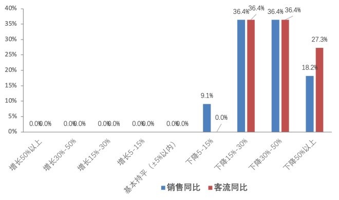 調研顯示,所有百貨、購物中心自2022年以來,銷售與客流相比去年同期均有所下降,超過八成(81.8%)的百貨、購物中心企業(yè)表示,其銷售和客流同比去年的下降幅度均超過15%。