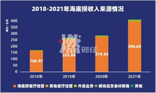 餐廳經(jīng)營收入依舊是主要收入來源,該項業(yè)務(wù)2021年的貢獻(xiàn)占海底撈總收入的96.0%,金額從2020年的人民幣274.34億元上升到2021年的人民幣394.64億元,增長了43.9%,海底撈將餐廳收入增長歸因于新餐廳數(shù)量增加及營業(yè)天數(shù)增加。