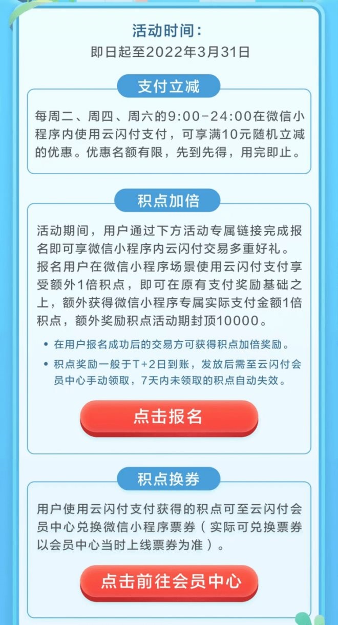 即日起至3月31日期間,每周二、周四、周六9時至24時,用戶在微信小程序內付款時,選擇“云閃付”支付且訂單金額大于等于10元,即可參與隨機立減活動。