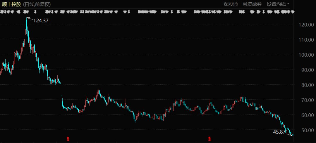 當(dāng)日順豐股價一字跌停,之后長期、連續(xù)下跌至今,市值相比最高時蒸發(fā)掉3000億元之多,跌幅高達(dá)六成。而且截至目前,股價仍沒有調(diào)頭向上的意思。
