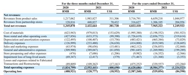 瑞幸公布2021年財務(wù)數(shù)據(jù):經(jīng)營層面仍未實現(xiàn)盈利