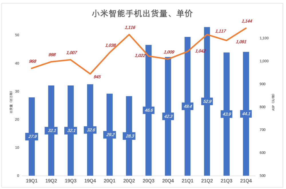 2019年Q1,小米智能手機(jī)銷售均價(jià)(ASP)為968元,2019年Q3首次突破1000元。2021年Q4,ASP達(dá)到1144元、較2020年Q4提高了13.3%。
