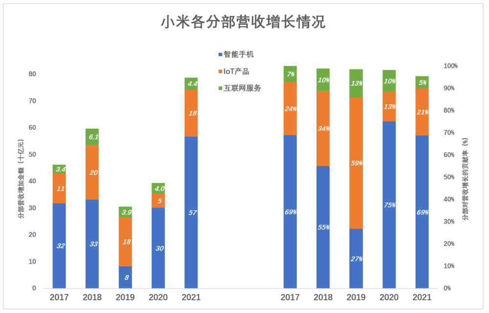 2021年智能手機(jī)銷售收入增長24.7%至2089億,與“IoT 產(chǎn)品”收入合計(jì)占營收的比例仍是89.5%。
