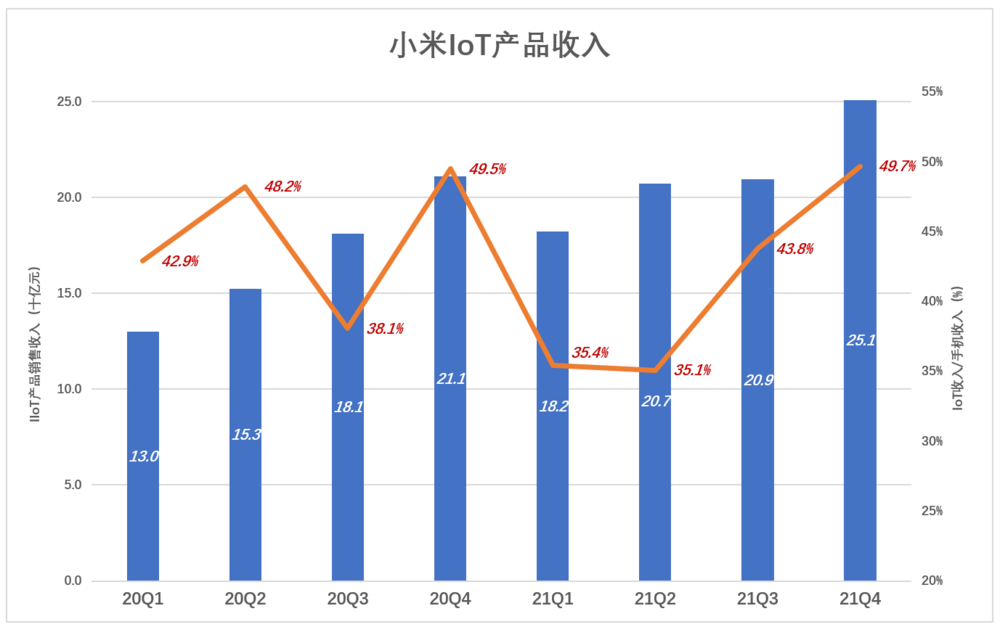 過往八個(gè)季度中有五個(gè)季度,IoT產(chǎn)品收入超過手機(jī)銷售收入的40%。2021年Q4,IoT產(chǎn)品收入達(dá)251億、為手機(jī)收入的49.7%。