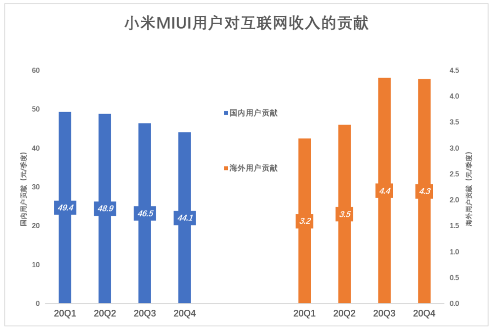 取期初、期末MAUs均值作為整個(gè)季度用戶基數(shù)。發(fā)現(xiàn)2021年各季度,國內(nèi)MIUI用戶每季度貢獻(xiàn)44元~49元互聯(lián)網(wǎng)收入;海外用戶每季貢獻(xiàn)3.2元~4.4元互聯(lián)網(wǎng)收入。