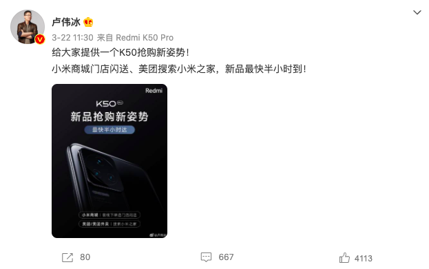 就在財(cái)報(bào)發(fā)布的幾個(gè)小時(shí)前,小米集團(tuán)合伙人盧偉冰在微博低調(diào)官宣:“美團(tuán)搜索小米之家,新品最快半小時(shí)到!”
