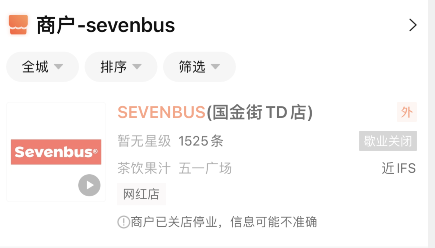 近日,新式茶飲品牌SEVENBUS長沙唯一門店已經(jīng)關(guān)閉。目前,在大眾點評搜索該店鋪,已經(jīng)顯示關(guān)店停業(yè),不過在官網(wǎng)該店還顯示存在。