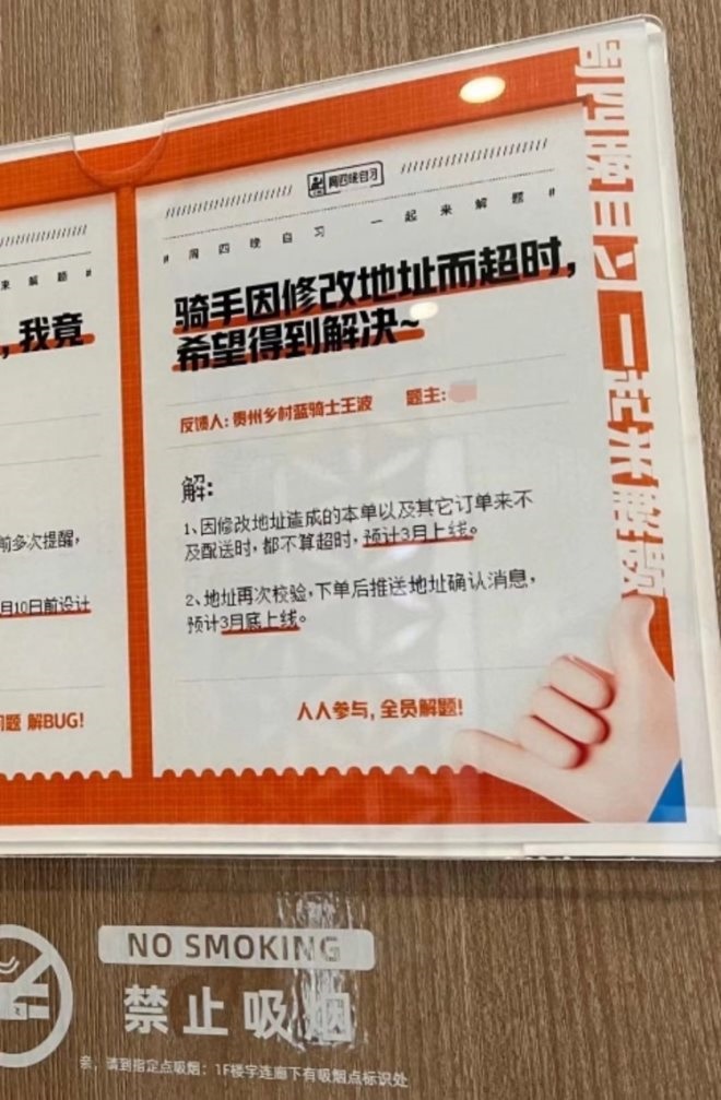 2月24日晚“晚自習(xí)”直播的“騎手因修改地址而超時(shí)”Bug,就來自一位餓了么騎手的反饋:經(jīng)常接到顧客打來電話要求修改地址,費(fèi)時(shí)費(fèi)力也依然經(jīng)常超時(shí),這應(yīng)該更及時(shí)地調(diào)整騎手的配送時(shí)間。