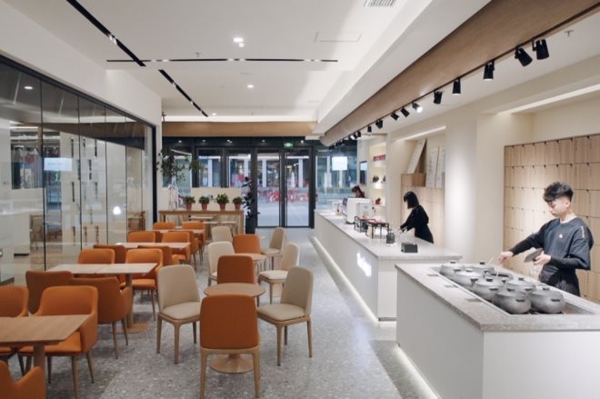 純白空間與木質(zhì)紋理相搭配,以簡約風(fēng)呈現(xiàn)東方美學(xué)。店內(nèi)設(shè)置了10米長桌吧臺,現(xiàn)場展示沏茶工藝。除了散座之外,門店內(nèi)還設(shè)置有獨立包間。