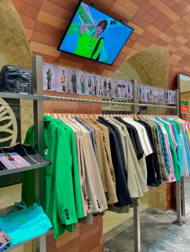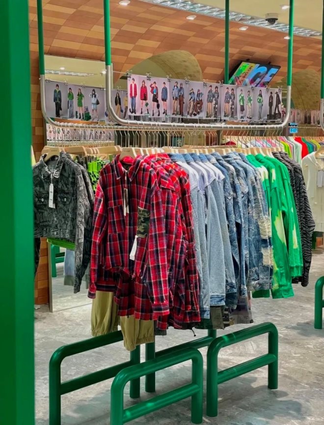 NO ONE ELSE店鋪以生活中最熟悉的地下通道為場景,墻面仿照真實的地下通道設(shè)計;服裝的展示架主要運用了金屬材質(zhì),有些保留了金屬原有的顏色,有些則是運用了盡顯潮流的綠色。