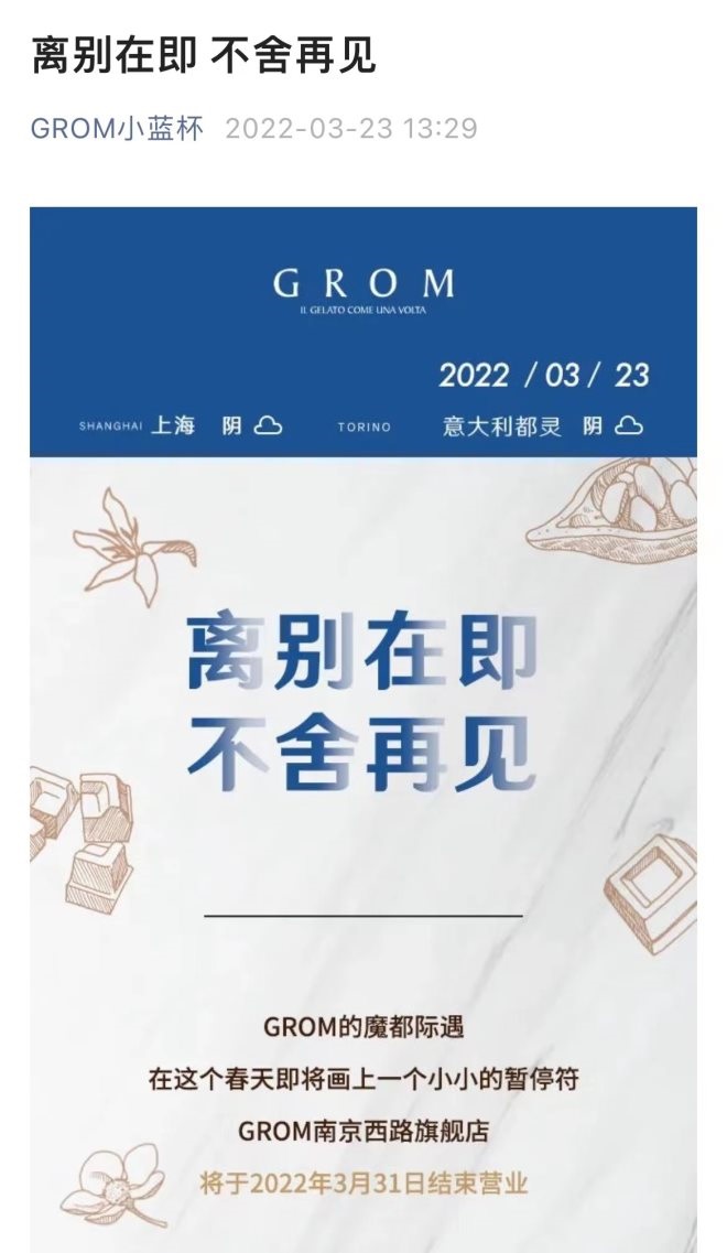 3月23日,GROM小藍(lán)杯官方公眾號發(fā)出一則公告:GROM南京西路旗艦店將于2022年3月31日結(jié)束營業(yè)。該店也是大陸首家GROM門店。