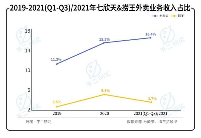 招股書顯示,2019~2021年前三季度,七欣天的外賣業(yè)務(wù)的收入占比分別為11.2%、15.5%和16.4%,遠高于同期可比上市公司水平;撈王2019年~2021年上半年外賣業(yè)務(wù)的收入占比則分別為2.5%、5.3%和3.7%,其回落或是受疫情期間餐廳停業(yè)的影響。