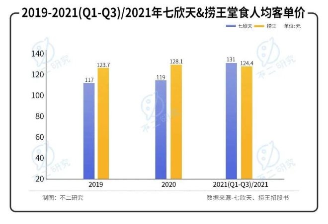 招股書顯示,2019~2021年前三季度,七欣天堂食業(yè)務(wù)的人均客單價分別為117元、119元和131元;2019年~2021年,撈王客單價分別為123.7元、128.1元和124.4元。而海底撈2021年上半年客單價為107.3元,在二者襯托下顯得格外“平價”。