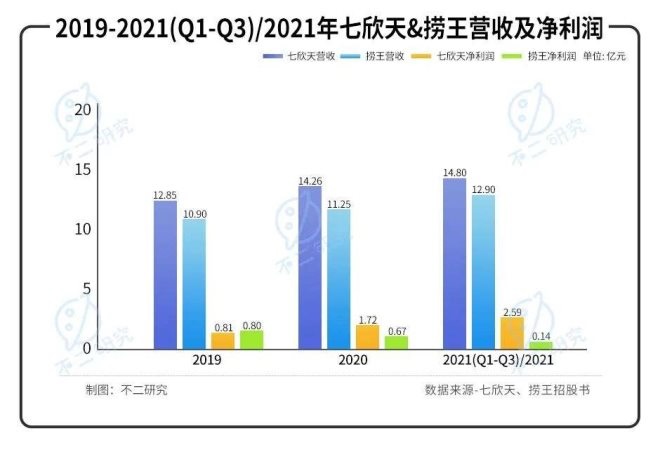 招股書顯示,2019~2021年前三季度,七欣天的營業(yè)收入分別12.85億、14.26億和14.80億元,其中2021年前三季度同比增速為49.42%;2019年~2021年,撈王實現(xiàn)營收10.9億元、11.25億元和12.90億元,2021年同比增長15.6%。