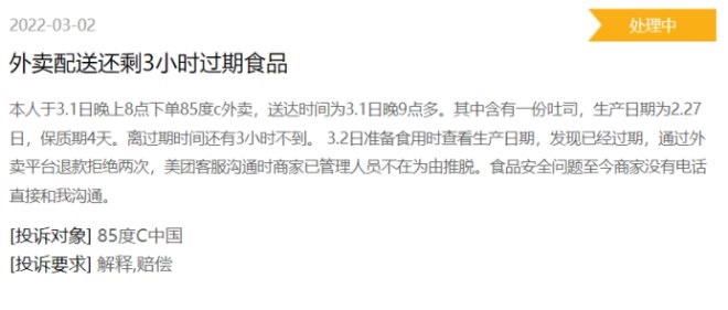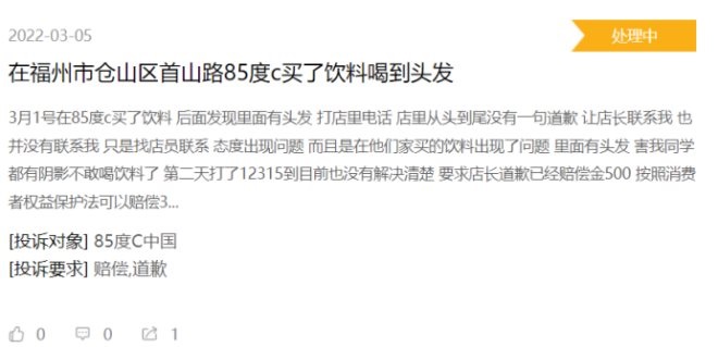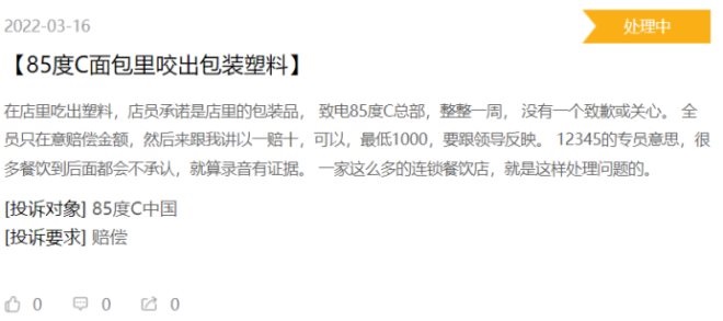二是加盟模式,因?qū)用说甑目刂撇粐?yán),導(dǎo)致品牌形象受損,從2014年起陷入一系列食品安全漩渦。2014年85°C被曝使用地溝油、2018年人民日?qǐng)?bào)點(diǎn)名批評(píng)85°C上海所有門(mén)店的的肉松面包并非使用真正的肉松、2020年上海市市場(chǎng)監(jiān)管局爆出85°C當(dāng)天制作“后天”蛋糕。在黑貓平臺(tái)上也能看到有消費(fèi)者投訴在面包里吃到包裝塑料、飲料里有頭發(fā)、外賣(mài)配送臨期食品……