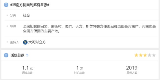 3月17日,大河財(cái)立方官方微博發(fā)布話題#河南方便面到底有多強(qiáng)#,閱讀次數(shù)超1.1億,還有多家媒體進(jìn)行跟蹤報(bào)道。