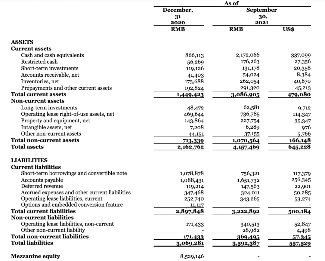 每日優(yōu)鮮2021Q3資產(chǎn)負債表
