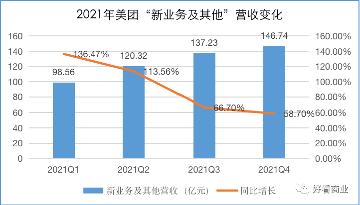 美團(tuán)新業(yè)務(wù)的營收增速也在下半年明顯放緩。2021年前兩個(gè)季度,美團(tuán)“新業(yè)務(wù)及其他”營收增速均遠(yuǎn)超100%。Q3和Q4的同比增速則一步步放緩,分別只有66.7%和58.7%。