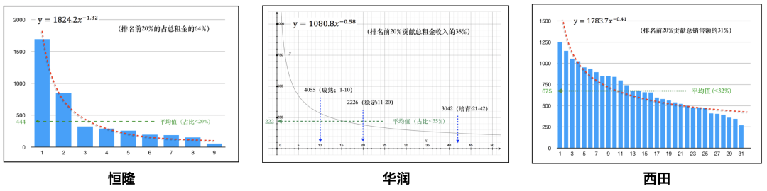 關(guān)鍵是上海購(gòu)物中心的情況不是一個(gè)特例,而是普遍現(xiàn)象。不僅是對(duì)一個(gè)市場(chǎng),而且對(duì)在一個(gè)擁有眾多購(gòu)物中心的連鎖企業(yè)中的情況也是一樣,請(qǐng)看圖中所列的國(guó)內(nèi)外購(gòu)物中心的領(lǐng)導(dǎo)企業(yè)恒隆、華潤(rùn)和西田2019年的租金或銷售額的分布情況。見(jiàn)圖3。