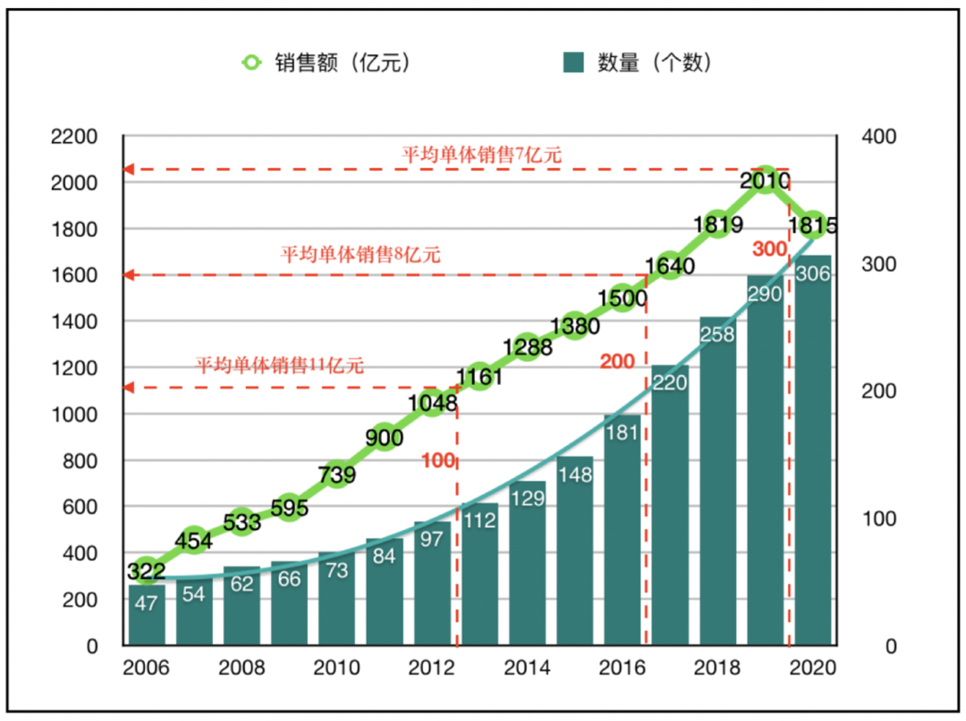 這里,還是以上海購(gòu)物中心市場(chǎng)的數(shù)據(jù)說(shuō)明。圖5是上海購(gòu)物中心從2006年成規(guī)模起步到2020年的數(shù)量增長(zhǎng)和銷售額變化的情況。