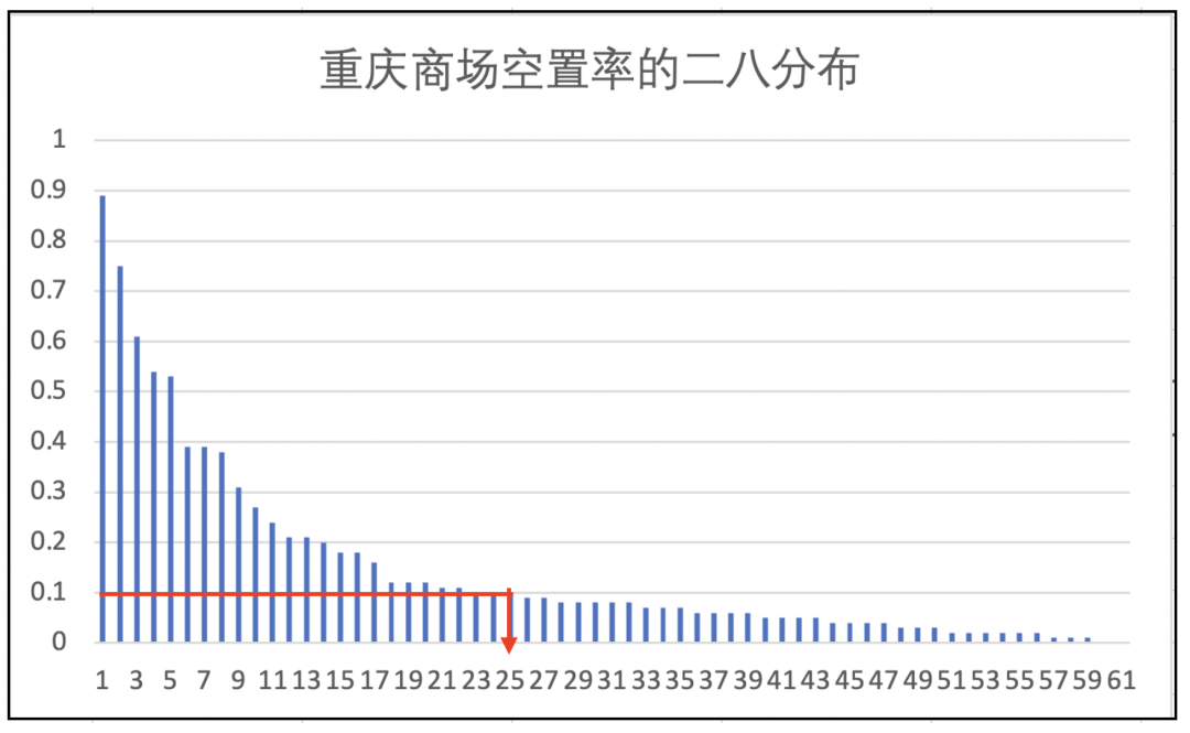 另外,空置率也是衡量購(gòu)物中心營(yíng)運(yùn)的一個(gè)重要指標(biāo)。近日,關(guān)于購(gòu)物中心空置率的報(bào)道很多,感覺(jué)大多數(shù)商場(chǎng)平均控制率都在10%上下。10%的平均空置率也許給人的感覺(jué)還好,還可以努力一把。筆者僅根據(jù)西南216個(gè)購(gòu)物中心中的重慶地區(qū)的61個(gè)商場(chǎng)做了二八剖析。見(jiàn)圖4 。