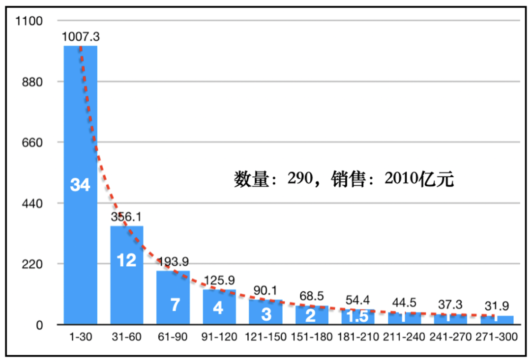 購(gòu)物中心營(yíng)運(yùn)的一個(gè)重要指標(biāo)是銷售額。以上海購(gòu)物中心市場(chǎng)為例,2019年上海有290個(gè)購(gòu)物中心,總銷售額2010億元。人們可能會(huì)很自然地想到上海購(gòu)物中心的平均銷售額約為7億元(2010/290=7),而且占上海購(gòu)物中心總數(shù)的2/3都應(yīng)該達(dá)到或超過(guò)平均值(正態(tài)分布)。而事實(shí)是上海購(gòu)物中心的銷售額是二八分布的。如圖2所示。