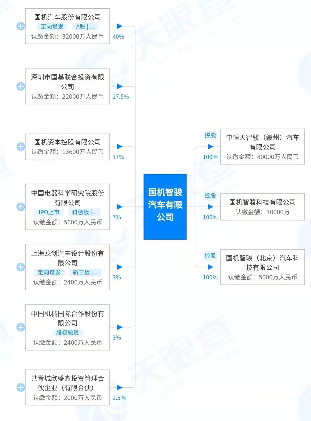 天眼查信息顯示,國(guó)機(jī)智駿汽車(chē)有限公司,是由國(guó)機(jī)集團(tuán)組織旗下企業(yè)成立的、擁有自主知識(shí)產(chǎn)權(quán)的新能源汽車(chē)制造公司,該公司致力于打造中高端汽車(chē)品牌。股權(quán)信息顯示,其大股東為國(guó)機(jī)汽車(chē)股份有限公司,持股40%,而國(guó)機(jī)汽車(chē)的控股股東為央企中國(guó)機(jī)械工業(yè)集團(tuán)有限公司,持股70.54%。