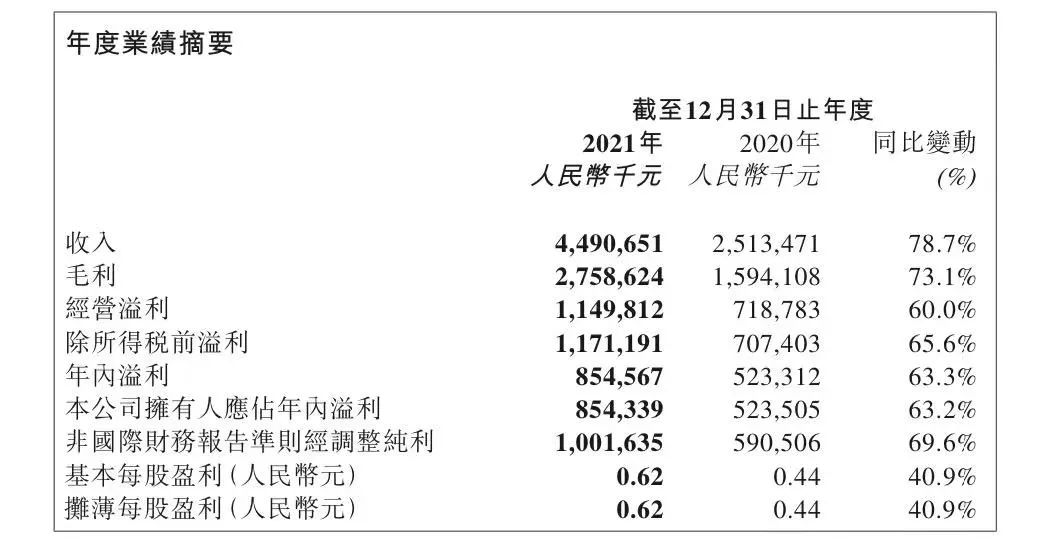 在眾多新消費(fèi)品牌的2021年年報(bào)中,泡泡瑪特的成績(jī)單還算是比較亮眼的。2021年泡泡瑪特實(shí)現(xiàn)營(yíng)收44.9億元,同比增長(zhǎng)78.7%;調(diào)整后凈利潤(rùn)同比增長(zhǎng)69.6%至10.02億元;公司擁有人應(yīng)占年內(nèi)溢利約8.54億元,同比增長(zhǎng)63.2%。由于品牌產(chǎn)品的毛利率下降,全年毛利率由63.4%下滑至61.4%。
