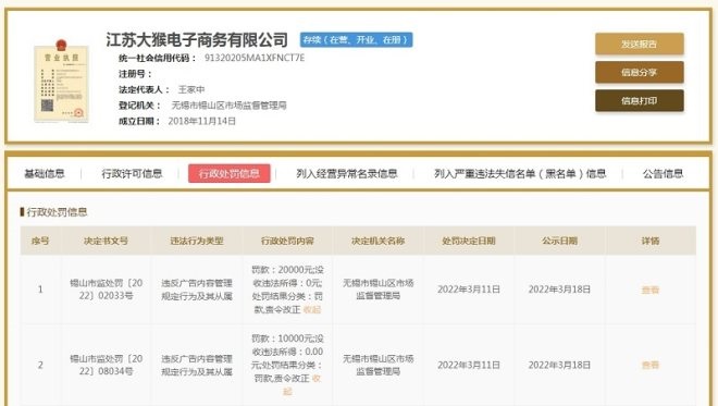 國家企業(yè)信用信息公示系統(tǒng)顯示,今年3月,雅迪全資持股的江蘇大猴電子商務(wù)有限公司因違反廣告內(nèi)容管理規(guī)定行為及其從屬,被無錫市錫山區(qū)市場監(jiān)督管理局罰款兩次,共計3萬元。
