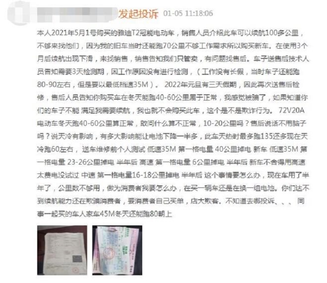 有消費者投訴稱,其在去年5月購買雅迪T2冠能電動車時,銷售人員介紹此車可以續(xù)航100多公里,然而消費者使用三個月后續(xù)航出現(xiàn)下滑(當(dāng)時車子還能跑80—90公里左右,但是要以最低擋速)。今年1月車輛送檢,消費者被售后人員告知冬天能跑40—60公里屬于正常。消費者認(rèn)為雅迪電動車店大欺客。
