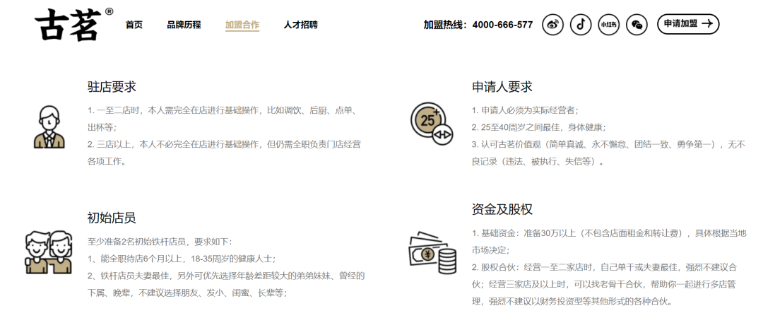 從2011年開(kāi)始做起加盟的古茗,已經(jīng)有一套非常成熟的打法和篩選機(jī)制:年齡在25至40周歲;一至二店時(shí),投資者需要完全在店進(jìn)行基礎(chǔ)操作,三店及以上,投資者也需要全職負(fù)責(zé)門(mén)店經(jīng)營(yíng)工作;一到二店時(shí)不建議合伙。
