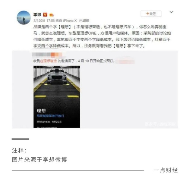 這樣的效果,有時(shí)是正向的。比如,理想汽車一直以來極力宣傳的自己是“第一家盈利的造車新勢力”,原因之一就是李想的“摳門”,他曾在微博上表示,原來理想汽車的名稱從“理想制造”變成“理想”,僅是為了降低車標(biāo)及線下店燈箱的一點(diǎn)制作成本。
