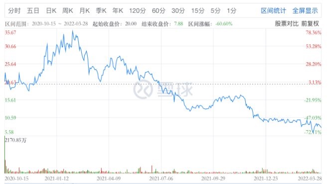 然而沒(méi)過(guò)多久,名創(chuàng)優(yōu)品便迎來(lái)了至暗時(shí)刻,而且至今仍未走出。截至2022年3月28日收盤(pán),名創(chuàng)優(yōu)品的股價(jià)為每股7.88美元,總市值暴跌60.6%至24.14億美元。