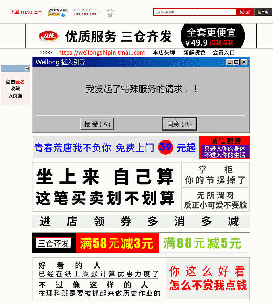 2016年12月,屢次因營銷出圈的衛(wèi)龍嘗到了“甜頭”,趁熱打鐵在自己的官方網(wǎng)店推出全新的店面廣告。據(jù)網(wǎng)店店鋪頁面顯示,衛(wèi)龍食品旗艦店充斥著大量類似“又粗又長的老伙計(jì)”、“坐上來 自己算”、“鹵多了 看東西容易模糊”、“小哥 吃豆腐嗎”、“熱情的隔壁老丸”、“足控福利”的廣告宣傳語,不少網(wǎng)友調(diào)侃“懷疑自己點(diǎn)錯了網(wǎng)址”,衛(wèi)龍也在頁面特別提醒——“你逛的是淘寶,不是你想的那種”。