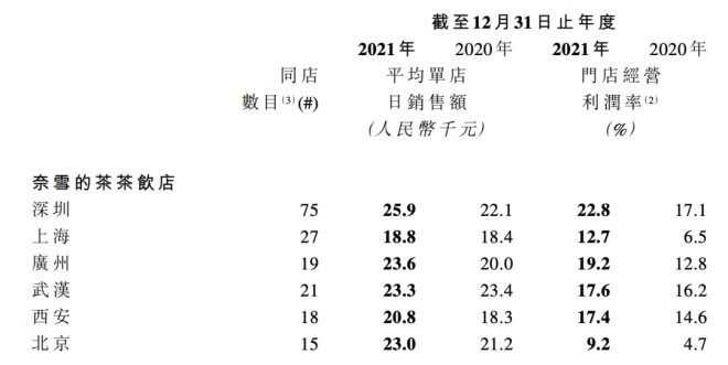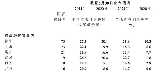奈雪在半年報(bào)和年報(bào)中,都披露了上述六個(gè)一線和新一線城市中,同店的平均單店日銷售額。