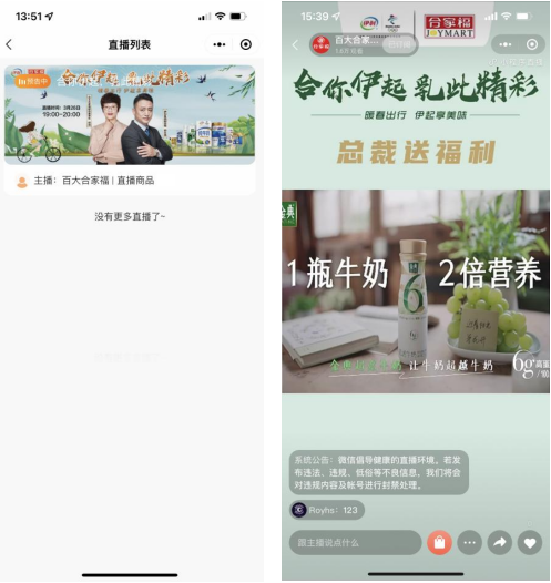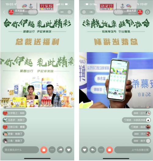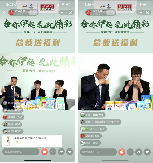 為豐富品牌營銷活動,百大合家福黨委書記、董事長鄧鴻與伊利集團(tuán)副總裁郭云龍親自踏進(jìn)直播間做起了現(xiàn)場直播。