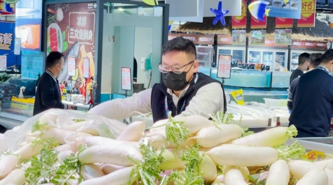 ▲疫情期間人手不夠,家樂福上海萬里店店長季林楓巡店時(shí)親自整理生鮮貨品