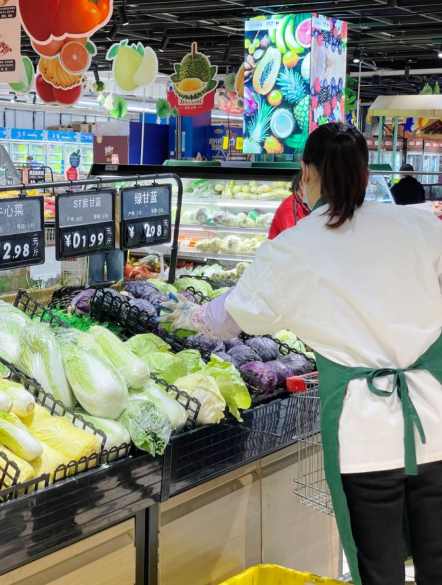 身為店長的季林楓,需要時(shí)刻對市場保持敏銳嗅覺及時(shí)應(yīng)變,協(xié)調(diào)訂貨、補(bǔ)貨,以應(yīng)對各種突發(fā)情況。除了需要協(xié)調(diào)生鮮的蔬菜、肉類商品一日兩次配送,快速補(bǔ)貨,米面糧油、方便速食等民生類商品,每天也需要根據(jù)門店動(dòng)態(tài)銷量及時(shí)補(bǔ)貨,保障排面豐富豐滿。在入口查碼測溫區(qū)、果蔬肉蛋區(qū)、休閑食品區(qū)、烘焙區(qū)、個(gè)人護(hù)理區(qū)……他的足跡每天遍布全店上下各個(gè)區(qū)域、角落,日行早已超越3萬步。