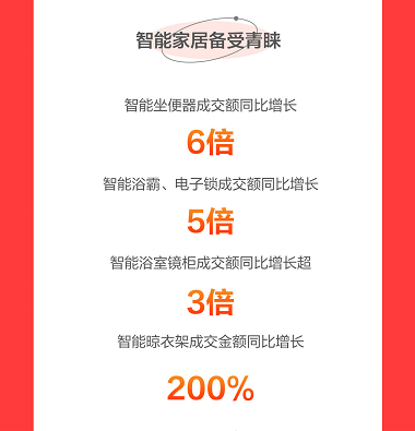 在長時間的居家狀態(tài)下,人們更加注重家居生活的舒適度和便利性,對智能產(chǎn)品有了更多樣化的需求。截至3月29日,智能坐便器成交額同比增長6倍,智能浴霸、電子鎖成交額同比增長5倍,智能浴室鏡成交額同比增長超3倍,智能晾衣架成交額同比增長2倍。