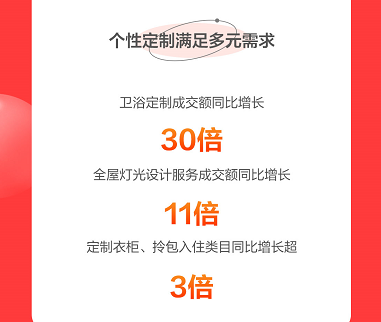 每個人都對理想生活有著獨特的設(shè)想,要打造個性化的家園,定制無疑是最佳途徑。京東居家提供的一系列定制服務(wù)廣受青睞,其中衛(wèi)浴定制成交額同比增長30倍,全屋燈光設(shè)計服務(wù)成交額同比增長11倍,定制衣柜成交額同比增長超3倍,拎包入住類目成交額同比增長超3倍。