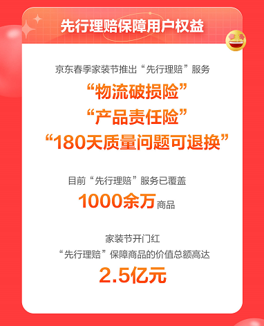 大件家具、裝修建材等產(chǎn)品在運輸過程中難免發(fā)生磕碰損傷,而且家裝類產(chǎn)品到貨后通常不會馬上投入使用,發(fā)現(xiàn)質(zhì)量問題時往往已經(jīng)過了質(zhì)保期,消費者的權(quán)益很難得到保障。針對這些痛點,京東居家在本次春季家裝節(jié)中推出全新“先行理賠”服務(wù),帶來“物流破損險”、“產(chǎn)品責(zé)任險”、“180天質(zhì)量問題可退換”等多重保障,讓眾多消費者吃下定心丸。目前“先行理賠”服務(wù)已覆蓋1000余萬商品,家裝節(jié)啟動28小時內(nèi),“先行理賠”保障覆蓋商品價值總額高達2.5億元。