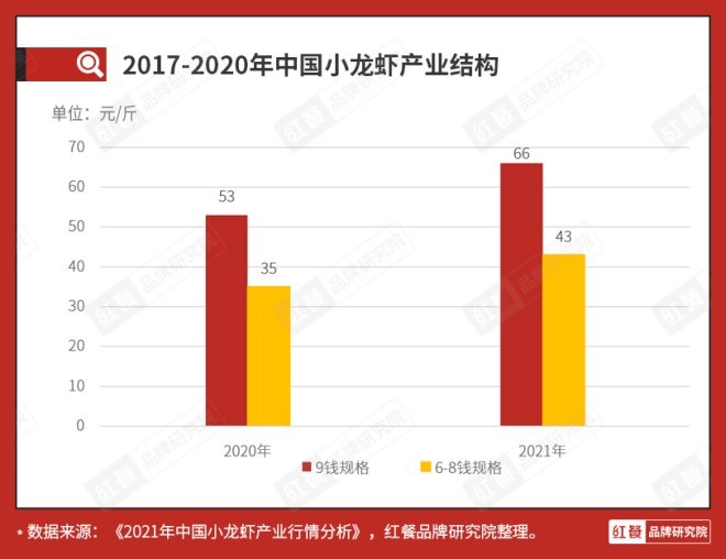 《2021年中國小龍蝦產業(yè)行情分析》顯示,2021年小龍蝦的總體價格高于2020年。以潛江中國小龍蝦交易中心數據為例,潛江市9錢規(guī)格的小龍蝦2020年平均價格為53元/斤,2021年平均價格為66元/斤,上升了24.5%;6-8錢規(guī)格小龍蝦2020年平均價格為35元/斤,2021年平均價格為43元/斤,上升了23%。