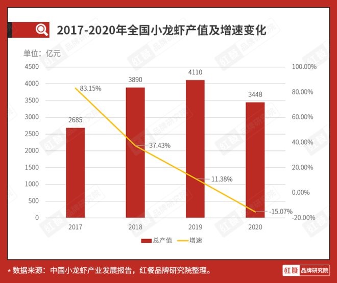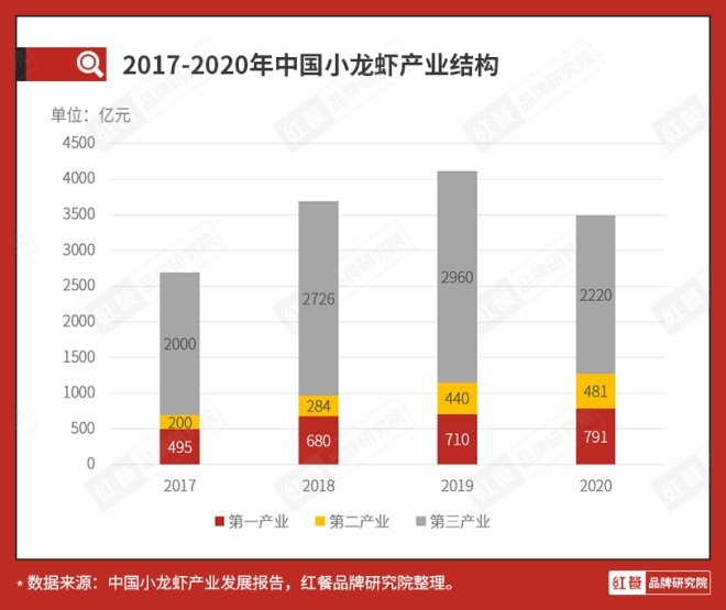 其中,小龍蝦養(yǎng)殖業(yè)產值約為748.38億元,同比增加11.35%;以加工業(yè)為主的第二產業(yè)產值約為480.08億元,同比增長9.11%;受新冠肺炎疫情沖擊,以餐飲為主的第三產業(yè)產值約為2220億元,同比下降25%。