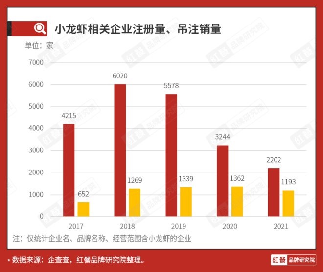 與此同時,小龍蝦相關企業(yè)的吊注銷量卻高居不下,到了2021年,吊注銷量達到了1193家,占到了新注冊量的一半。