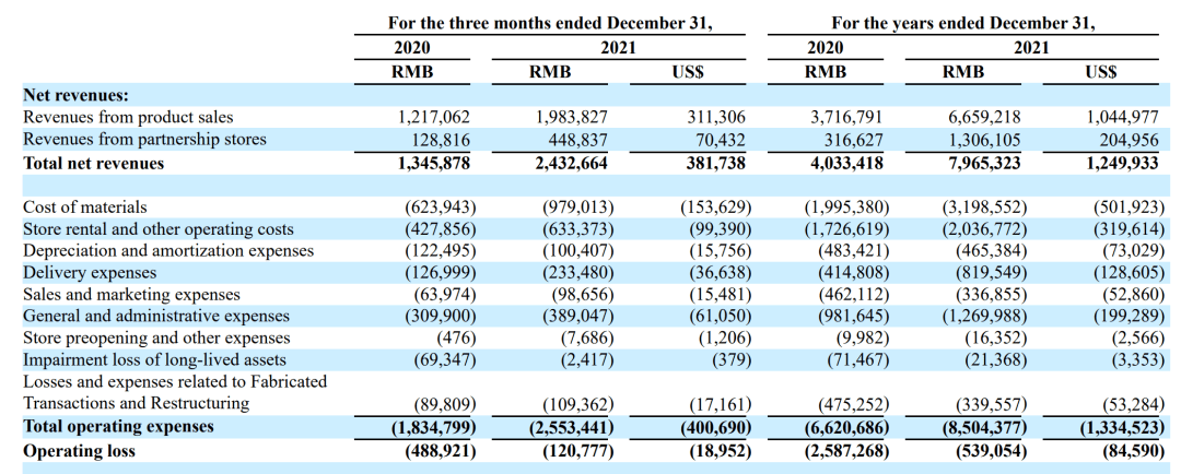 也就是說,在整體行情不佳的2021年,瑞幸收入幾乎翻倍,門店數(shù)量超過星巴克中國(guó),經(jīng)營(yíng)虧損大幅收窄。