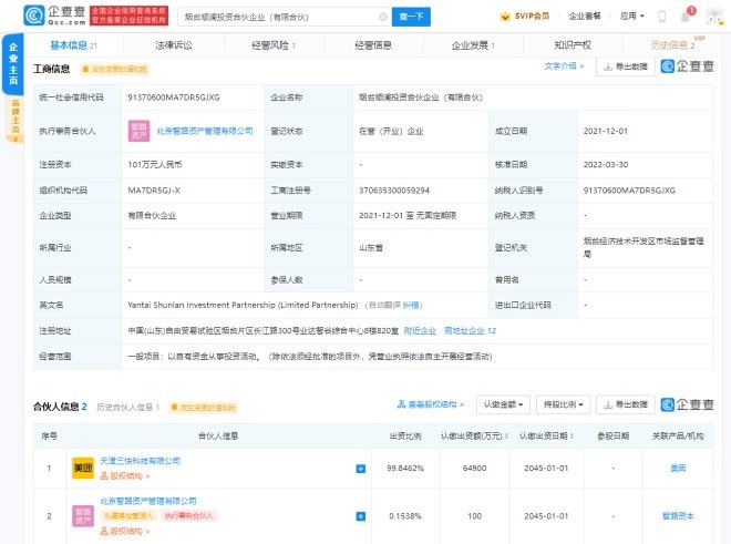 企查查信息顯示,該企業(yè)成立于2021年,執(zhí)行事務(wù)合伙人為北京智路資產(chǎn)管理有限公司,經(jīng)營范圍包含:以自有資金從事投資活動(dòng)。