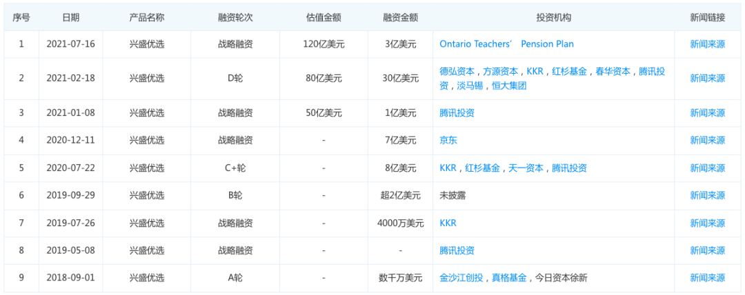 按照公開的媒體報道,2018年至今,興盛優(yōu)選累計融資額50億+美金(不考慮未到賬的),約350億人民幣。去年年中,興盛優(yōu)選的市值曾高達120億美金。