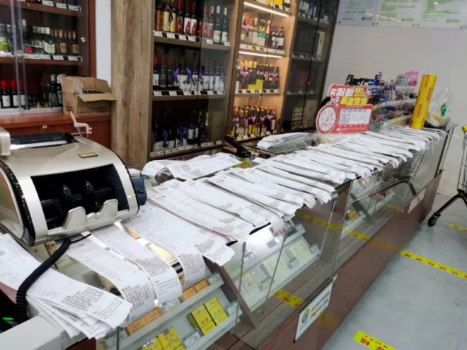 網(wǎng)上商城僅開通一小時(shí)就已爆單,突然增加的1700多個(gè)訂單給門店帶來前所未有的壓力。因疫情管控,務(wù)川本地員工均須居家隔離,門店僅有5人在崗——務(wù)川麒龍城市廣場店店長徐航、管理負(fù)責(zé)人劉亞飛、加工課長韓先果以及從綏陽鑫港國際店前來支援盤點(diǎn)工作的陳超麗和張正琴兩位家人!拔迦诵〗M”在店長的召集下,迅速分工,由門店管理負(fù)責(zé)人來負(fù)責(zé)前臺網(wǎng)單的打印歸類,其余家人全部投入配單中……